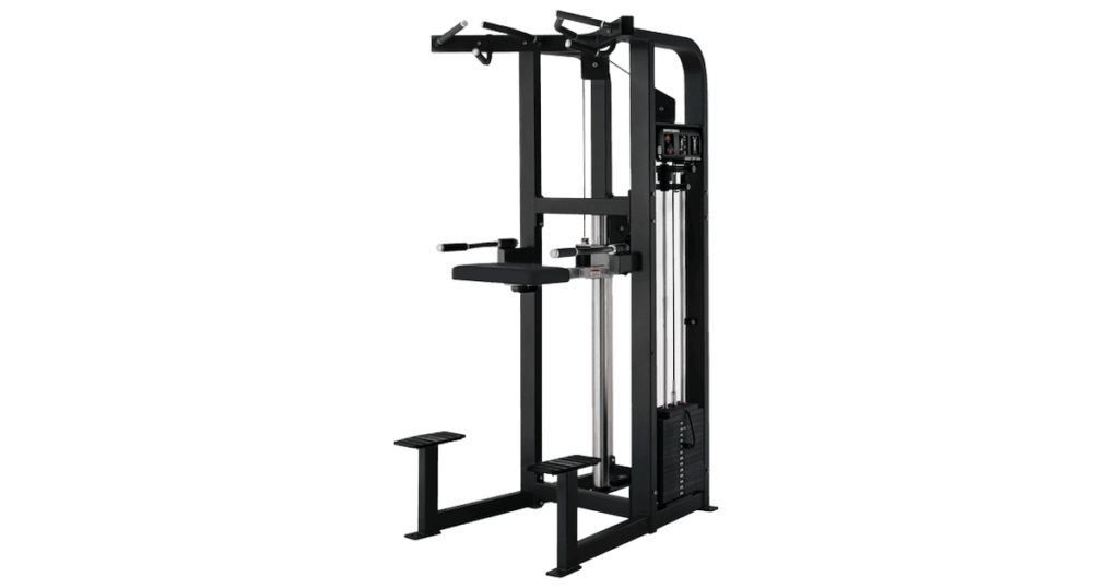 A machine like this is common in almost any regular gym. This particular machine is from Hammer Strength where you can do machine assisted dips and pull ups.